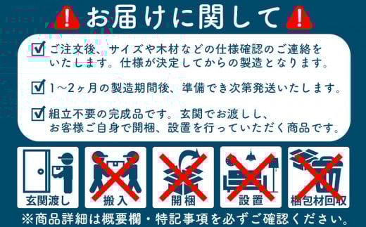 木部色等の仕様のご希望をお伺いしてからお作りしております。仕様のご希望決定後、1~2ヶ月後の発送となります。