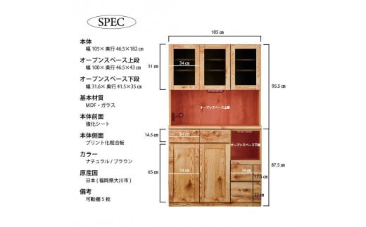 【Chatra/チャトラ 幅105cmオープンボード ブラウン】★シンプルでお部屋に合わせやすい食器棚