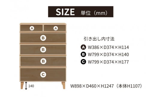 【ウォールナット】大川家具 幅90cm 5段 チェスト -gold-ゴールド