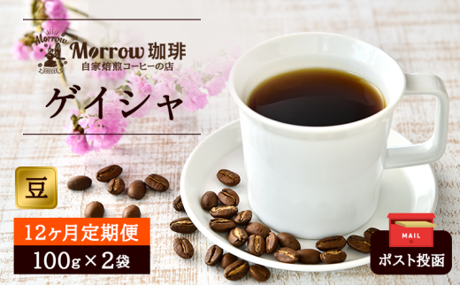 コーヒー豆 定期便 12ヶ月 Morrow珈琲 ゲイシャ 200g (100g×2) レギュラーコーヒー 珈琲 コーヒー 珈琲豆 ドリップコーヒー ドリップ 自家焙煎珈琲 自家焙煎コーヒー 12回 1年 お楽しみ 福岡 福岡県 小郡市