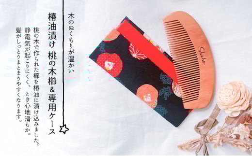 名入れ 椿油漬け 桃の木櫛 ケース付き 黒 和柄 椿油 椿オイル クシ くし 静電気 防止 木製 髪 ヘアケア ギフト プレゼント 贈り物