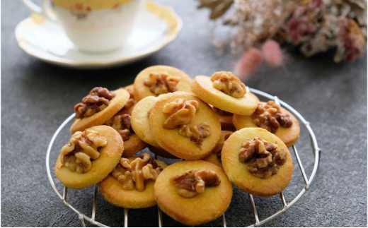 生地の粉はアーモンドパウダーだけを使用。くるみをトッピングした低糖質クッキーです。