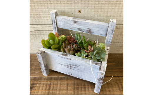 ハンドメイドの木製プランターに時期にあわせた多肉植物のカット苗と、多肉植物用の専用土をセットでお届けします。