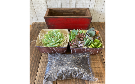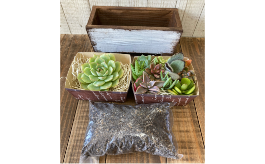ハンドメイドの木製プランターに時期にあわせた多肉植物のカット苗と、多肉植物用の専用土をセットでお届けします。