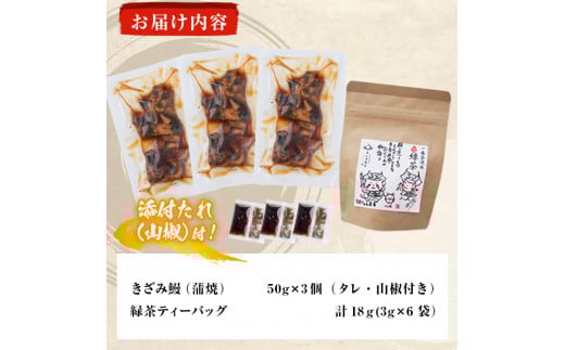【丑の日までに配送】鹿児島県産 きざみ鰻3p(計150g以上)×緑茶セット うなぎ 鰻 ウナギ きざみ鰻 真空パック うな丼 ひつまぶし お茶 茶 緑茶 ティーバッグ セット a1-034-us