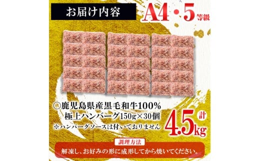 【入金確認後、2週間以内に発送】<A4・A5等級>鹿児島県産黒毛和牛100%使用極上手ごねハンバーグ計4.5kg(150g×30個) d0-033-2w