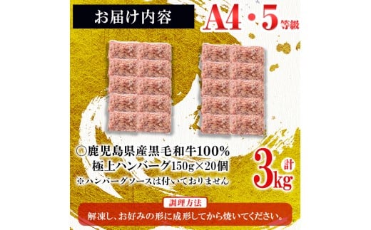 【入金確認後、2週間以内に発送】<A4・A5等級>鹿児島県産黒毛和牛100%使用極上ハンバーグ計3kg(150g×20個) 黒毛和牛 和牛 ハンバーグ 冷凍ハンバーグ 肉 牛肉 国産 九州産 鹿児島県産 ミンチ 100% 小分け A4 A5 日本一 人気 b8-037-2w