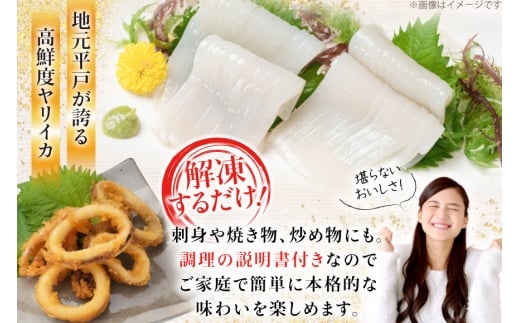 地元平戸が誇る高鮮度のヤリイカを、解凍するだけでお刺身や焼き物、炒め物にも。調理の説明書付きなので、ご家庭でも簡単に本格的な味わいを楽しめます。