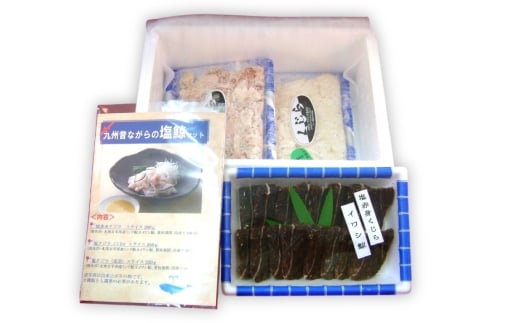 鯨の赤身の部分と胸の白身(うね)の部分と尾(尾羽)の部分を塩蔵した塩くじらのセットです。