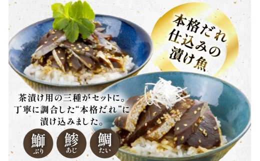 鰤(ぶり)、鯵(あじ)、そして鯛の茶漬け用の三種がセットに。丁寧に調合した“本格だれ”に漬け込まれています。