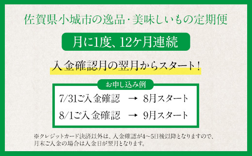 ご入金確認の翌月からスタートし、以降は12ヶ月連続のお届けとなります。(毎月1回配送・計12回)