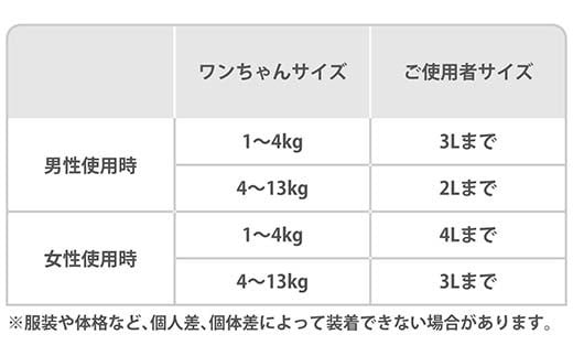 飼い主さんやワンちゃんの身体に合わせて長さを誰でも簡単に使えるファスナー式で、3つのサイズに調節できます。ワンちゃんの大きさや季節によって服装が変わっても、身体の中心の近い位置で抱っこができるので、快適に抱っこができます。家族での共有使いもできるので便利です。