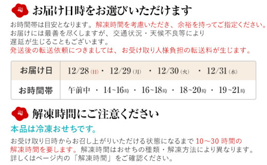 おせちは生ものです。日持ちのしない食材を含め、様々な具材がありますので開封後はできるだけ早めにお召し上がりください。