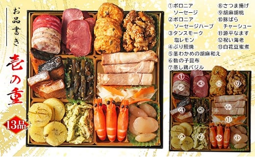 ボロニアソーセージ3枚、ボロニアソーセージハーブ3枚、タンスモーク塩レモン30g、ぶり照焼4切、茎わかめの胡麻和え35g、数の子昆布4個、蒸し鶏バジル30g、さつま揚げ3個、胡麻胡桃25g、豚ばらチャーシュー3枚、源平なます30g、祝い海老3尾、白花豆蜜煮35g