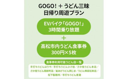 「電動バイクGOGO!」3時間の乗り放題+高松市内うどん食事券(300円×5枚)
