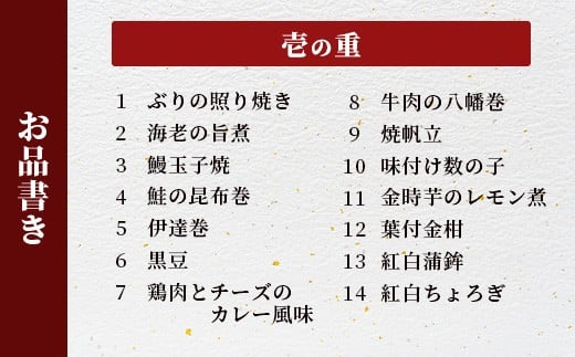 ぶりの照り焼き ・ 海老の旨煮 ・ 鰻玉子焼 ・ 鮭の昆布巻 ・ 伊達巻 ・ 黒豆 ・ 鶏肉とチーズのカレー風味 ・ 牛肉の八幡巻 ・ 焼帆立 ・ 味付け数の子 ・ 金時芋のレモン煮 ・ 葉付金柑 ・ 紅白蒲鉾 ・ 紅白ちょろぎ