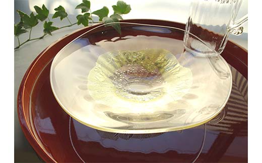 透明ガラスと銀箔が光を受けて波模様にゆらめき柔らかな風を感じられるお皿です。