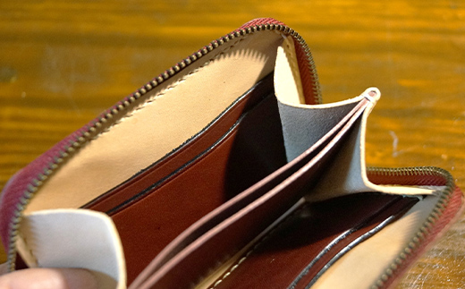 【内容】ハンドメイドのヌメ革製ラウンドファスナーミニウォレット。