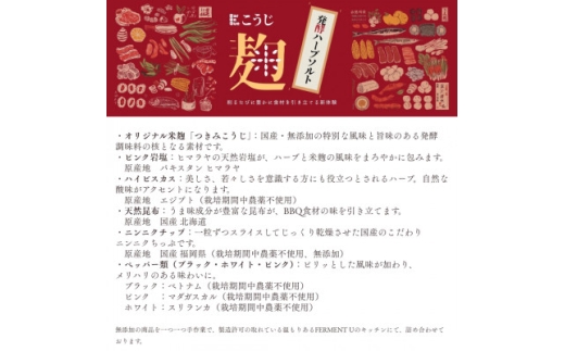 ・ピンク岩塩:ミネラル分を感じる天然岩塩で、ハーブと米麹の風味をまろやかに包みます。