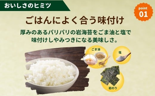 原材料名:乾のり(韓国産)、コーン油、食塩、ごま油/調味料(アミノ酸等)、酸化防止剤(ローズマリー抽出物、チャ抽出物)、(一部にごまを含む)