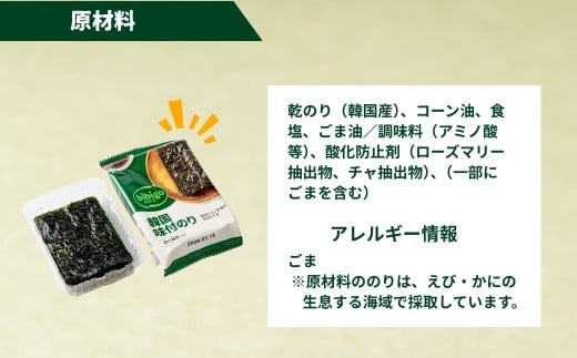 原材料名:乾のり(韓国産)、コーン油、食塩、ごま油/調味料(アミノ酸等)、酸化防止剤(ローズマリー抽出物、チャ抽出物)、(一部にごまを含む)