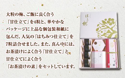 甘仕立て個包装梅干し4粒、はちみつ仕立て7粒、甘仕立て90g、お茶漬けの素7袋