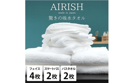 高吸水スーパーゼロふわふわタオルセット エアリーシュ ×【ホワイト】1セット(フェイスタオル4枚・スマートバスタオル2枚・バスタオル2枚)