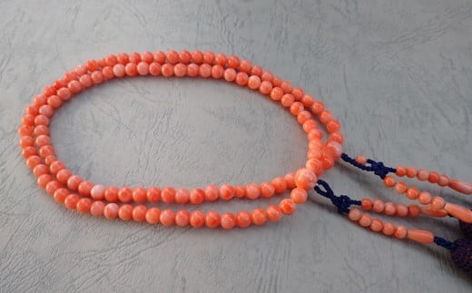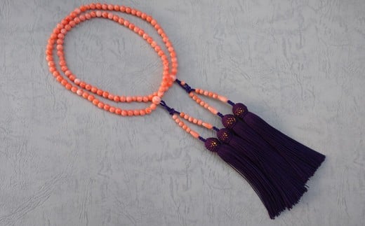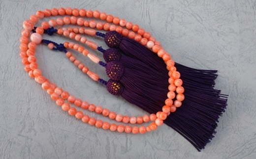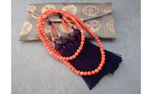 深海珊瑚玉(カラーグレード:5):5.5mm、親玉:7.5mm、全体の重さ:43.8g、房:紫房正絹、数珠袋付き※小キズアリ