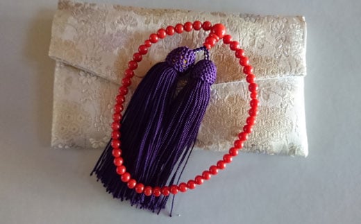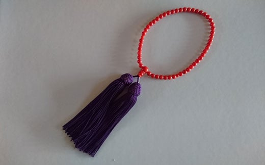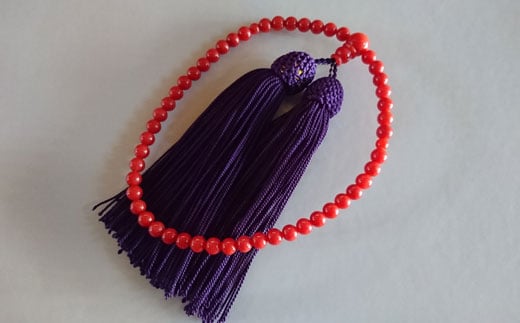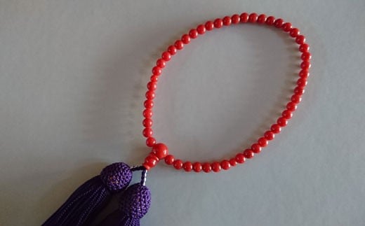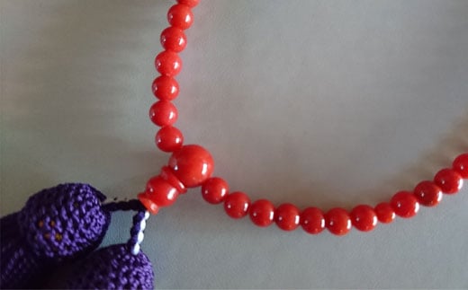 サルジ珊瑚(カラーグレード:3.5):5.2mm玉、親玉:8.5mm、房:正絹(古代紫)、数珠袋付き