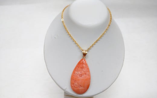 桃珊瑚(カラーグレード:3)小花手彫り:約26mm×約14mm、厚さ:約6mm、金具:K18、チェーン:真鍮40cm