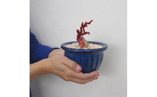 高知産血赤珊瑚(カラーグレード:5):約横4cm×高さ6cm、重さ(岩込み):32匁(約120g)*ミッド珊瑚チップ:200匁(約750g)*鉢(陶器)の大きさ:直径約12cm、高さ7cm