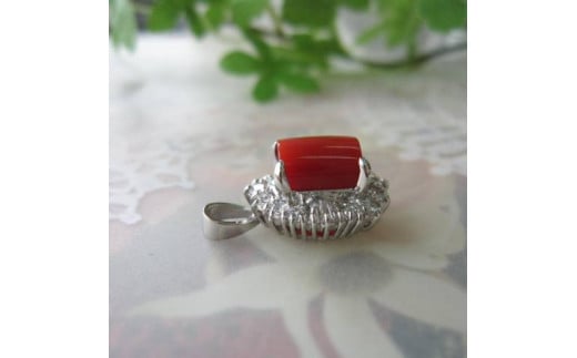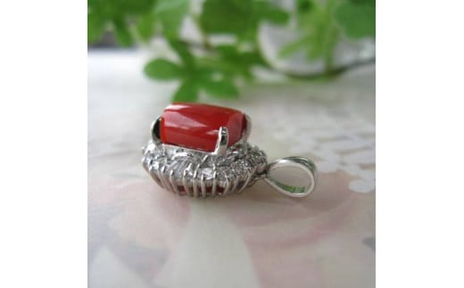 高知産赤珊瑚(カラーグレード:4.5):8.9mm×7.5mm、ペンダントの大きさ(バチカン部分除く):約16.8mm×14.3mm、厚み:約9.8mm、ダイヤモンド:0.70ct、重さ(金具込):5.6g、金具:プラチナ900、トップのみ