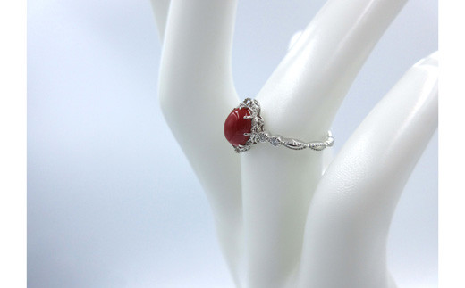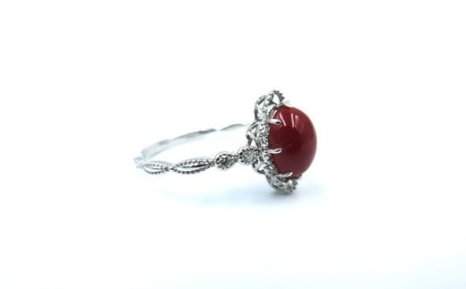 土佐沖血赤珊瑚(カラーグレード:5)約5.0mm×約7.0mm(カボション)、ダイヤ:0.03ct、金具(リング):プラチナ、リングサイズ:12号、※時間をいただければ、サイズ直し致します。