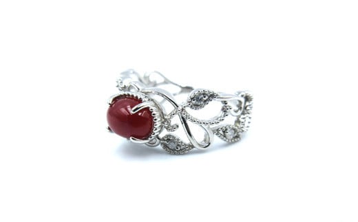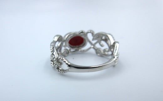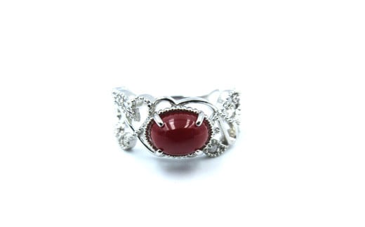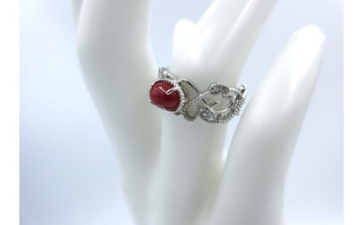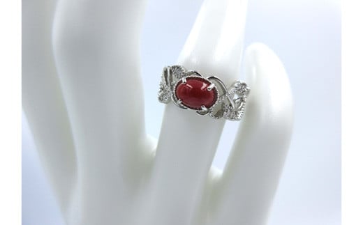 土佐沖血赤珊瑚(カラーグレード:5)約5.0mm×約7.0mm(カボション)、ダイヤ:0.05ct、金具(リング):プラチナ、リングサイズ:12号、※時間をいただければ、サイズ直し致します。