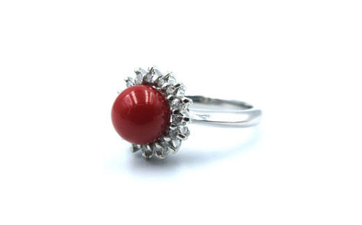 土佐沖血赤珊瑚(カラーグレード:3.5)約7.1mm玉、ダイヤ:0.16ct、金具(リング):プラチナ、リングサイズ:11号、※時間をいただければ、サイズ直し致します。