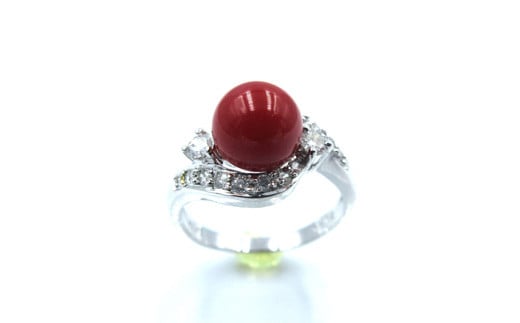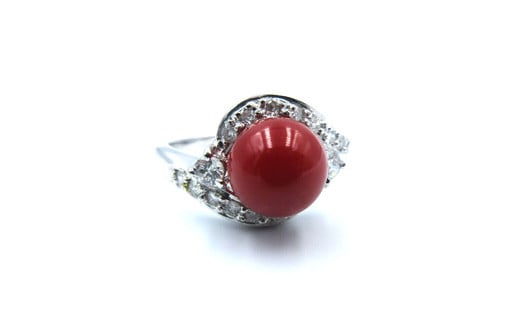 土佐沖血赤珊瑚(カラーグレード:4):約7.58mm玉、ダイヤ:0.25ct、金具(リング):プラチナ、リングサイズ:13号、※時間をいただければ、サイズ直し致します。