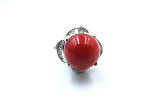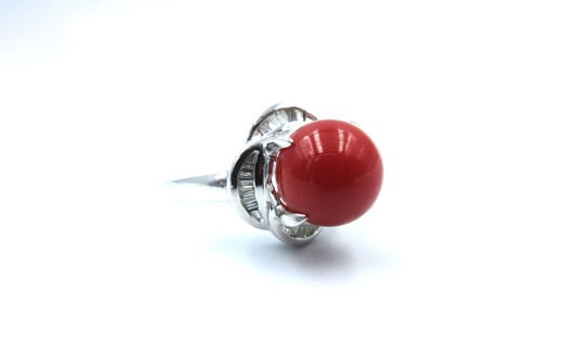 土佐沖血赤珊瑚(カラーグレード:3.5)約8.9m玉、ダイヤ:0.26ct、金具(リング):プラチナ、リングサイズ:12号、※時間をいただければ、サイズ直し致します。