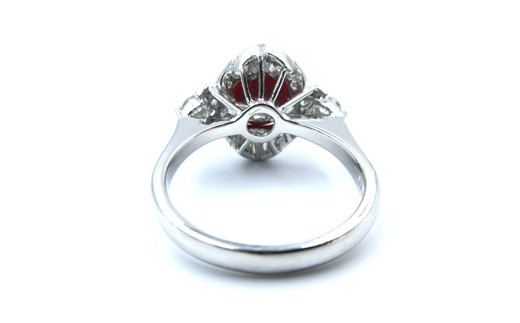 土佐沖血赤珊瑚(カラーグレード:4)約7.7mm玉、ダイヤ:0.44ct、金具(リング):プラチナ、リングサイズ:11号、※時間をいただければ、サイズ直し致します。