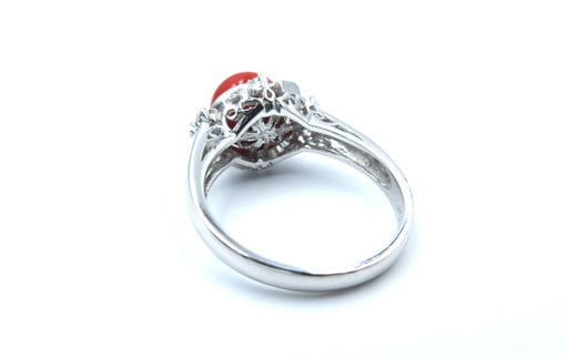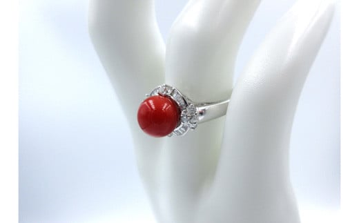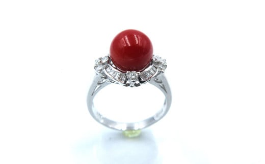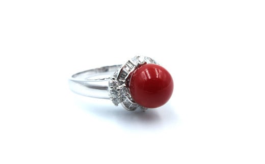 土佐沖血赤珊瑚(カラーグレード:4)約8.5mm玉、ダイヤ:0.4ct、金具(リング):プラチナ、リングサイズ:14号、※時間をいただければ、サイズ直し致します。
