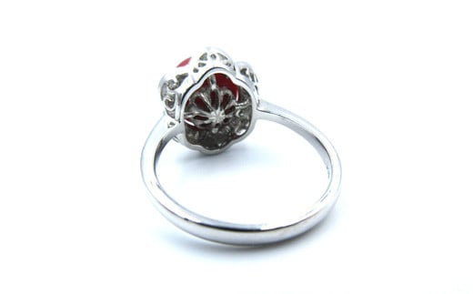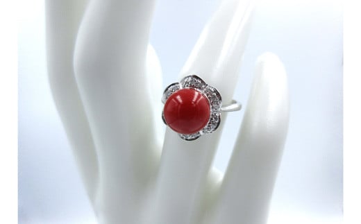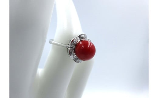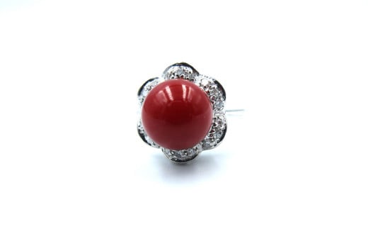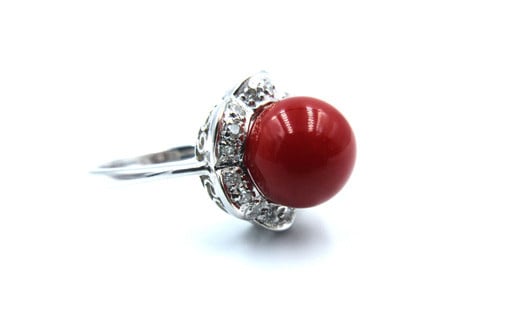 土佐沖血赤珊瑚(カラーグレード:4)約9.1mm玉、ダイヤ:0.19ct、金具(リング):プラチナ、リングサイズ:12号、※時間をいただければ、サイズ直し致します。