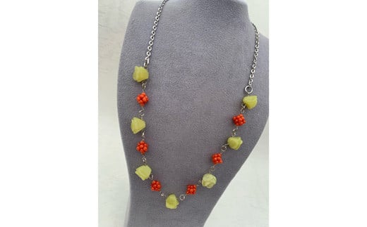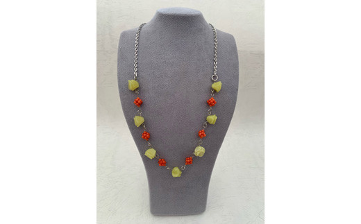 サルジ珊瑚(カラーグレード:2):約2mm玉、オリーブクォーツ(バラ彫り)、