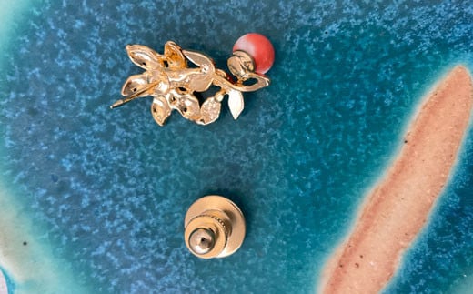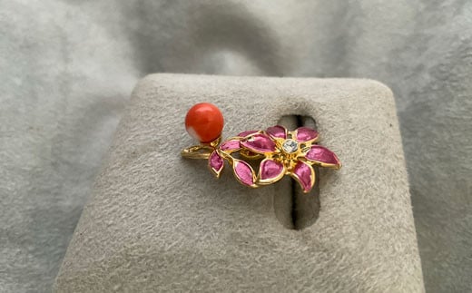 地中海珊瑚(カラーグレード:4)丸玉:6.4mm、ピンクカラーの花デザイン:21mm×15mm×7mm(花の中心に石入り)、