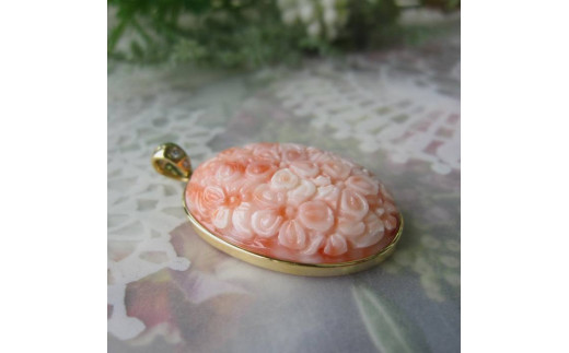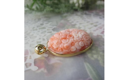 ピンク珊瑚(カラーグレード:2):33.2mm×24.3mm、厚さ:8mm、金具:K18、