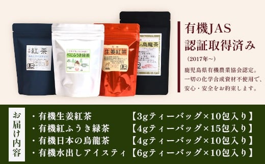 <お茶農家の手もみ茶葉>お試しセット①(4種×1P)NT-509 |国産 有機栽培 茶葉 紅茶 ティーバッグ 生姜 緑茶べにふうき 烏龍茶 水出し アイスティー 手もみ 飲料 ドリンク 茶 お茶 南大隅町 鹿児島県