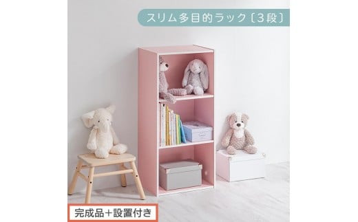 【完成品+設置付き】スリム多目的ラック〔3段〕(ピンク)カラーボックス 3段 収納 スリム 本棚 おしゃれ 大容量 ラック マルチラック 書棚 木製スリム収納 a4 ロータイプ 薄型 横置き 漫画 文庫本 AKONBR920068-0-PI