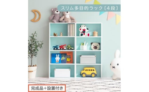 【完成品+設置付き】スリム多目的ラック〔4段〕(ブルー)カラーボックス 漫画 本棚 スリム 収納 横置き 薄型 収納棚 ロータイプ ラック コミック収納 薄型本棚 コミック コミックボックス木製 本 4段 棚 AKONBR920065-0-BL