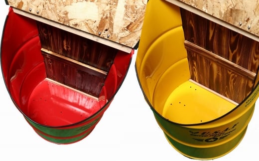 使用済みのドラム缶と木材(ハウスメーカーから頂戴した端材使用の場合有)を使用したSDGsな大型トラッシュボックス(鉄のやや武骨な感じと木の温もりの合わさった商品)です。