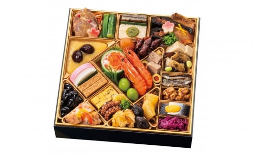 立山ポーク味噌漬、おくらわさび風味、きんぴらごぼう、梅麩、かじき昆布〆、炙り烏賊の翡翠味噌掛け、大豆やわらか煮、鮭骨昆布巻、鰤照焼、大根田舎煮、味付菜の花、五郎島金時の渋皮栗きんとん、ほたるいかしぐれ煮、玉こんにゃく旨煮、和風ミートローフ、スタッフドオリーブ、ミックスビーンズコンソメ煮、いくらなます、 海老旨煮、若桃蜜煮、紅白かまぼこ、トリュフ入りレーズン松風、ふくさ玉子、蛸やわらか煮、焼き茄子浸し、黒豆蜜煮、赤魚南蛮漬、数の子松前漬、鰤の子生姜煮、椎茸旨煮、高野豆腐含め煮、ツブ貝の山椒煮、田作り、くるみ甘露煮、鰊の黄味酢掛け、白きくらげ甘酢漬、紫キャベツのピクルス