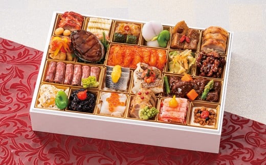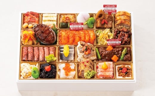 蜜汁叉焼、大豆やわらか煮、イカ白焼青麻鮮の香り、梅香る姫皮たけのこ、中華くらげ、ピリ辛きゅうり、桃餅、空豆蜜漬、黒酢の酢豚、酒醸鶏、塩きんぴら、赤魚エスカベッシュ、鮑オイスター煮、だし若布、海老のチリソース、ザーサイXO醤和え、くるみ飴炊き、ローストビーフ、ロマネスコオイル和え、鰊の黄味酢掛け、オニオンマリネ、真鯛の塩麹焼きトマトソース、かぶらのピクルス、ビーフシチュー、数の子ガーリッククリームチーズ、黒豆赤ワインジュレ、ペッパードロップ、スズキのカルパッチョ、白きくらげスイートマリネ、立山ポーク味噌漬、蟹の土佐酢ジュレ、紅白なます、いちじく入りクリームチーズ