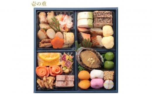 赤魚南蛮漬・焼帆立・かぶらの甘酢漬・味付け子持ちいか・梅人参煮・焼湯葉巻・海老とアスパラのテリーヌ・鮭西京焼・チキンオードブルパテ・カラスカレイ西京焼・海老黄金団子・鶏テリーヌオレンジ風味・スモークサーモン・くるみ甘露煮・さつま芋と豆のハニーマスタード風・ソーセージテリーヌ・鮑旨煮・菜の花おひたし・若もも甘露煮・あんずシロップ漬・白梅餅・紅梅餅・白ごま紅はるか・手毬餅